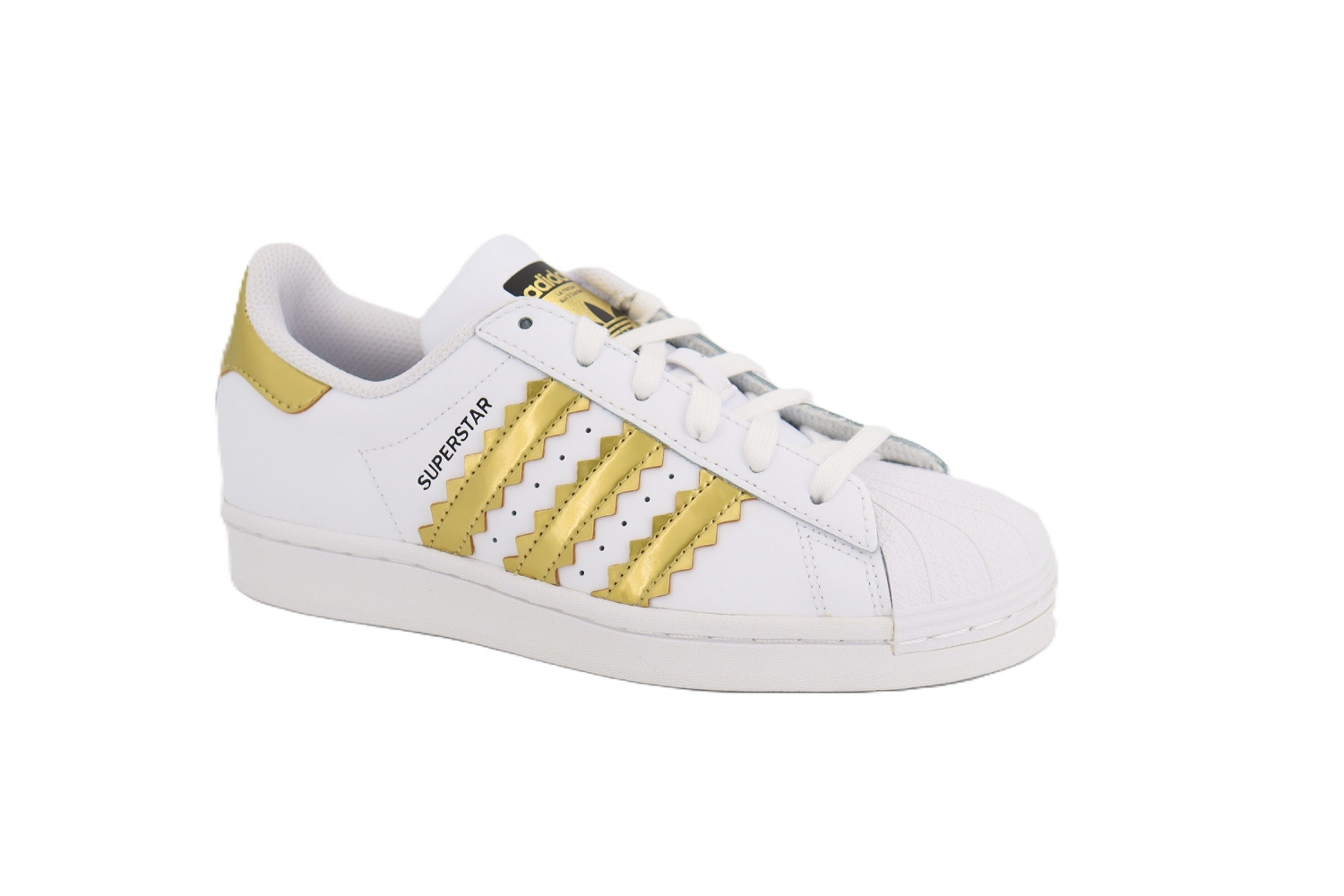 Icône intemporelle du streetwear, la Superstar de Adidas se décline ici dans une version féminine élégante. Confectionnée en cuir blanc, elle est sublimée par des bandes dorées qui apportent une touche lumineuse et raffinée au modèle emblématique. Sa silhouette iconique à bout renforcé, associée à une semelle confortable, en fait une basket facile à porter au quotidien, idéale pour twister aussi bien un look casual que plus habillé.