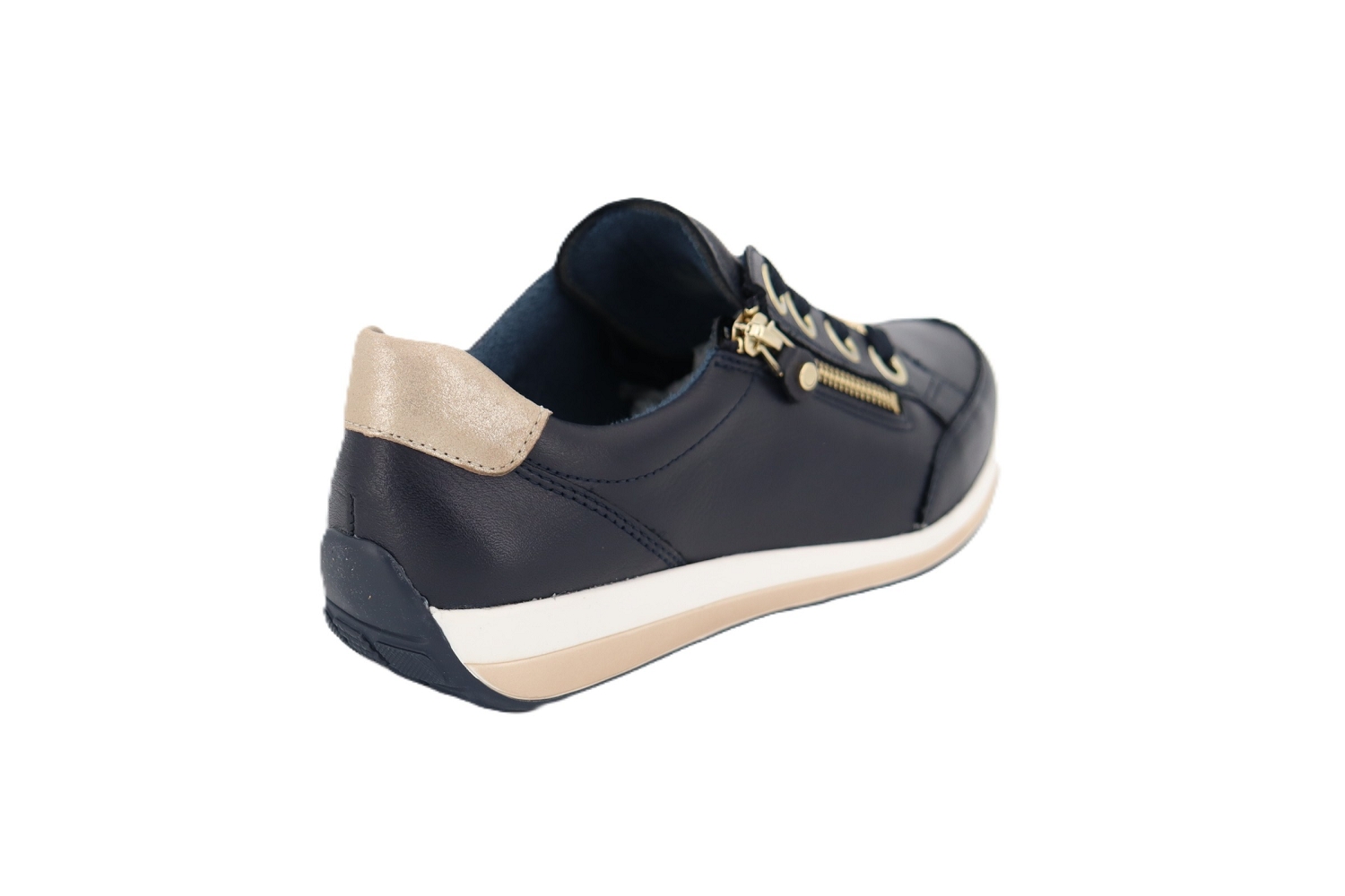 La basket Osakana de Ara associe style moderne et confort optimal pour accompagner vos journées avec élégance. Confectionnée en cuir bleu marine, elle se distingue par ses détails métallisés discrets qui apportent une touche lumineuse et raffinée. Son double système de fermeture, lacets et zip latéral, permet un enfilage facile tout en garantissant un ajustement précis. Montée sur une semelle légère et amortissante, elle offre un excellent confort de marche au quotidien. Une basket chic et pratique, idéale pour un look urbain confortable et élégant.