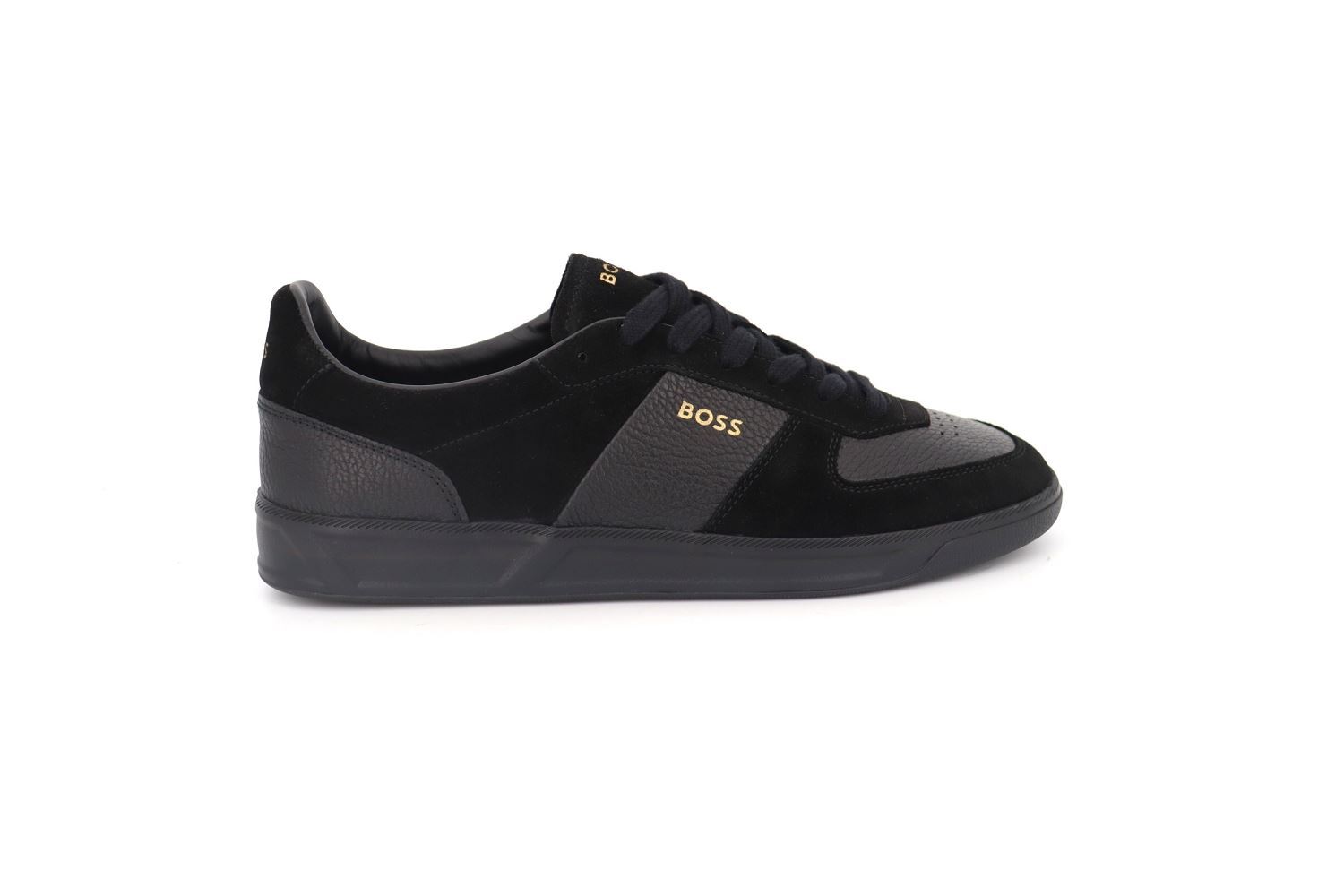 Les baskets fines Brandon de chez HUGO BOSS à semelle cupsole. Ces chaussures en cuir et cuir suédé sont ornées de logos en transfert dorés et d’un revers matelassé.