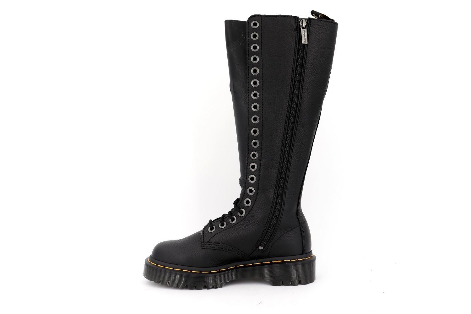 Hautes. Rebelles. Imposantes. Prenez le dessus avec nos boots 1B60 percutantes. Montées sur une semelle double épaisseur Bex pour encore plus de hauteur et de caractère, ces bottes montantes à 20 oeillets ont une silhouette vertigineuse. Conçues pour les plus audacieux, elles sont confectionnées avec un cuir souple Pisa Nappa et dotées d'un zip interne pour une meilleure facilité d'accès ainsi que de notre surpiqûre jaune signature et languette noire et jaune au talon.