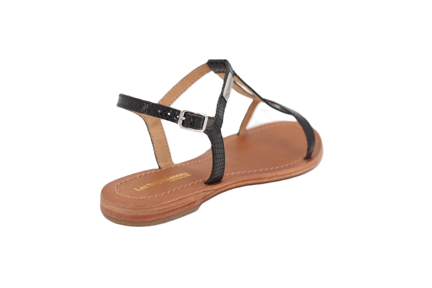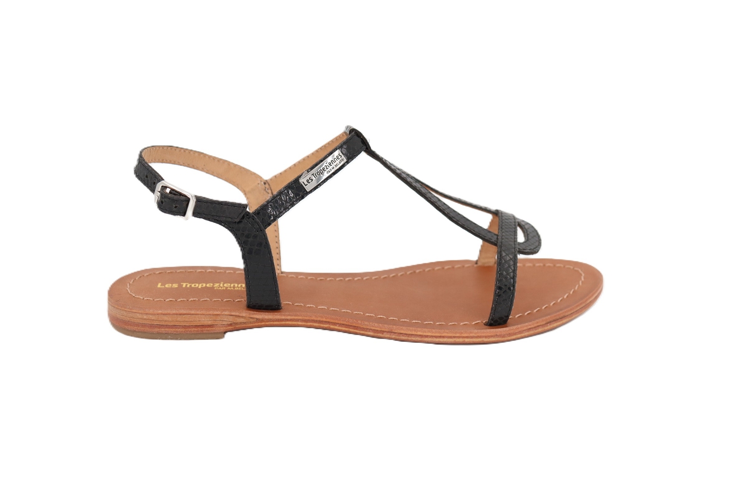 Élégante et intemporelle, la sandale nu-pieds HAMAT de chez Les Tropeziennes séduit par ses fines brides en cuir noir sublimées par un élégant imprimé serpent. Ce détail raffiné apporte du caractère à ce modèle estival tout en conservant une allure chic et féminine. Conçue pour allier style et confort, cette sandale plate femme dispose d'une bride arrière réglable qui assure un bon maintien au pied. Légère et facile à porter, elle accompagne aussi bien une robe d'été qu'un jean ou un pantalon fluide. Une sandale Les Tropeziennes idéale pour un look estival à la fois tendance et confortable.