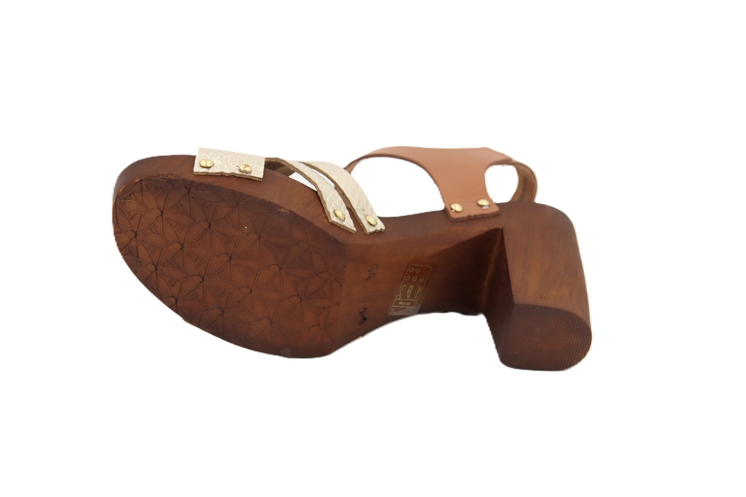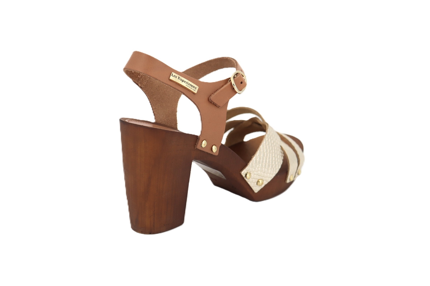La sandale nu-pieds Venice de chez Les Tropeziennes séduit par son allure élégante et affirmée. Confectionnée en cuir marron associé à des brides effet doré, elle joue sur les contrastes pour apporter une touche sophistiquée à vos tenues estivales. Son talon large effet bois et sa plateforme confortable offrent une belle hauteur tout en garantissant stabilité et confort au quotidien. La bride cheville réglable avec boucle assure un maintien parfait du pied. Une sandale féminine et tendance, idéale pour sublimer vos looks d'été avec style.