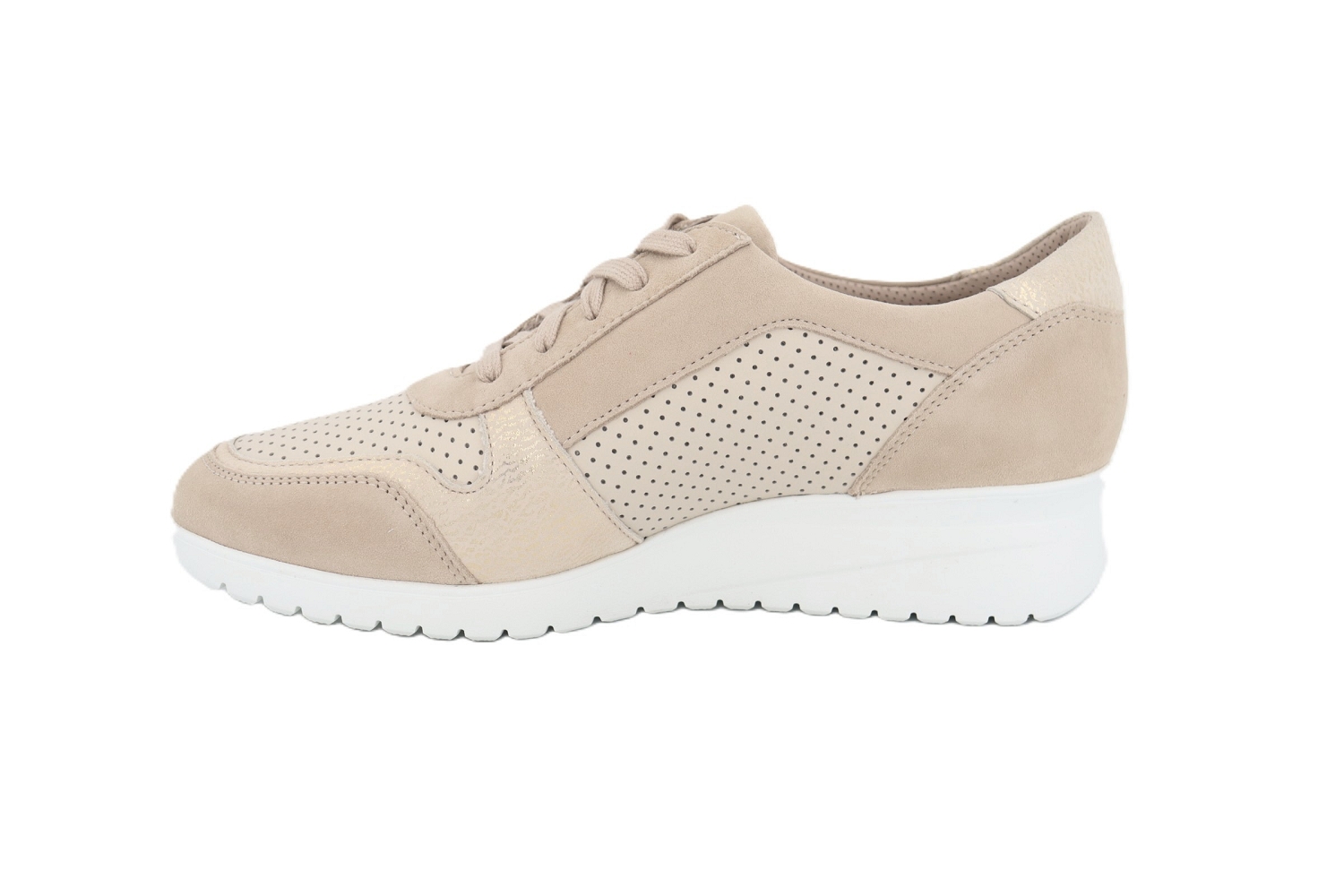 La Iasmina Perf de chez Mephisto revisite la sneaker avec un cuir beige délicatement perforé pour plus de légèreté et de respirabilité. Sa semelle compensée apporte une allure féminine tout en conservant une excellente stabilité, tandis que la semelle intérieure amortissante assure un confort durable au fil de la journée. Le zip latéral permet un enfilage facile et rapide, faisant de ce modèle un indispensable chic et polyvalent pour accompagner toutes vos tenues de saison.