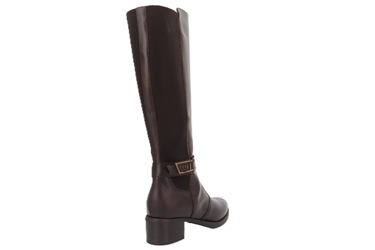 Optez pour l’élégance intemporelle avec cette botte NeroGiardini en cuir marron. Chic et raffinée, elle séduit par sa ligne épurée et sa tige haute mêlant cuir lisse et empiècement stretch pour un chaussant parfait et un confort optimal. Son petit talon stable offre une démarche naturelle tout en apportant une allure féminine et moderne. La boucle dorée subtilement placée ajoute une touche sophistiquée, signature du style italien. Facile à associer avec une robe, une jupe ou un jean slim, cette botte est un incontournable de la saison pour un look élégant au quotidien.