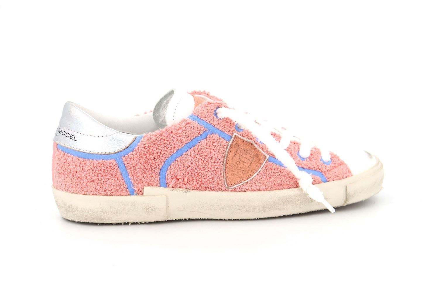 Les nouvelles baskets Prsx s'approprient les lignes des années 80 et les réinterprètent avec le charme des matières italiennes et des finitions brillantes. La tige blanche en cuir de vachette effet usé est associée à un col en cuir gris argenté contrasté comme l'écusson latéral et le liseré aux notes poudré. La semelle emblématique avec recouvrement asymétrique est fabriquée à la main avec un effet usé pour un look unique.