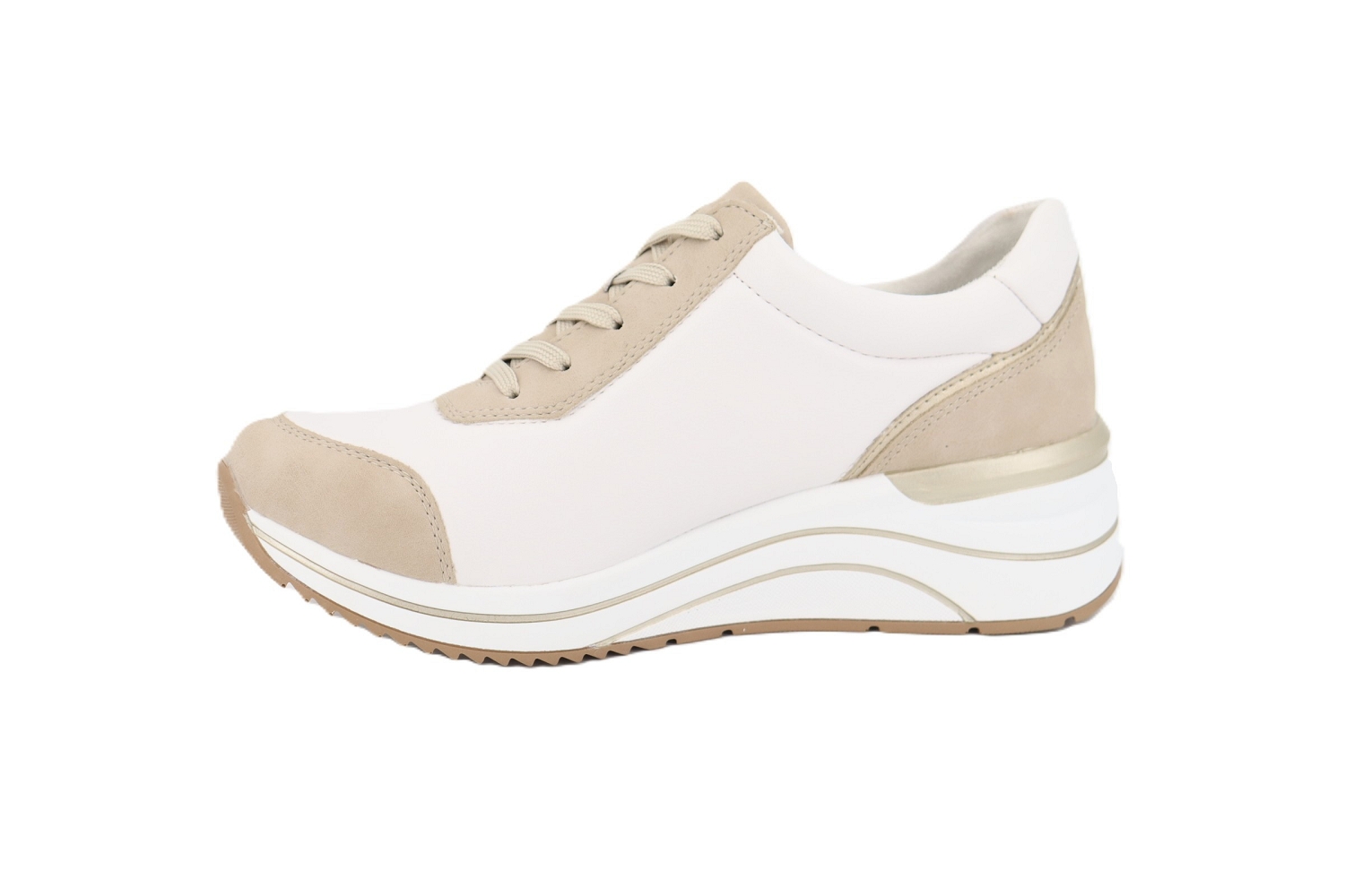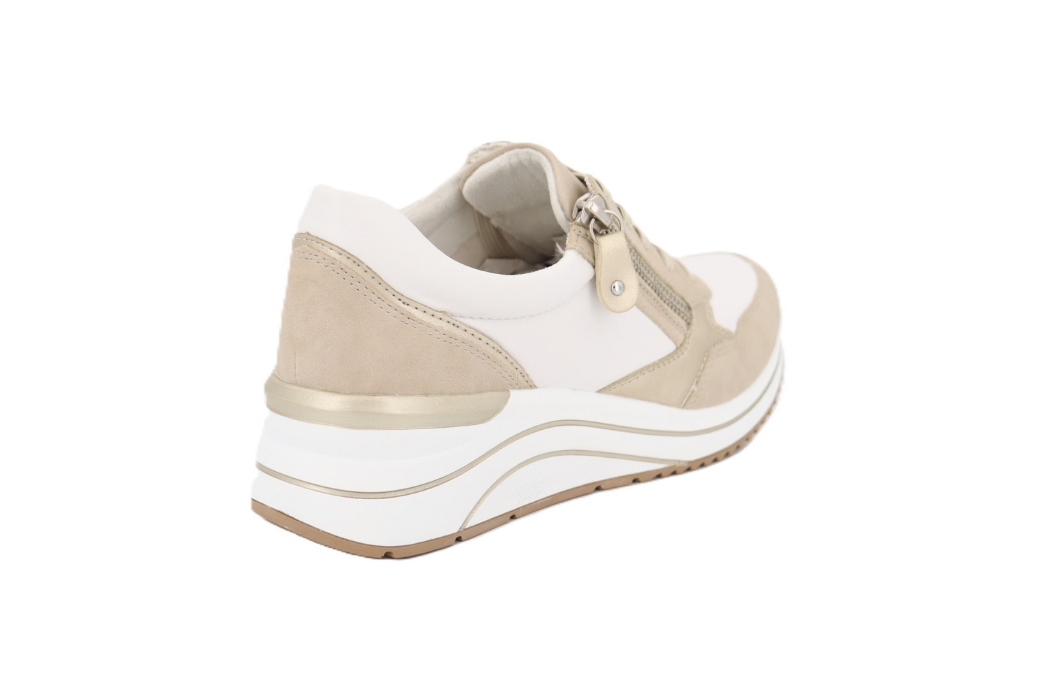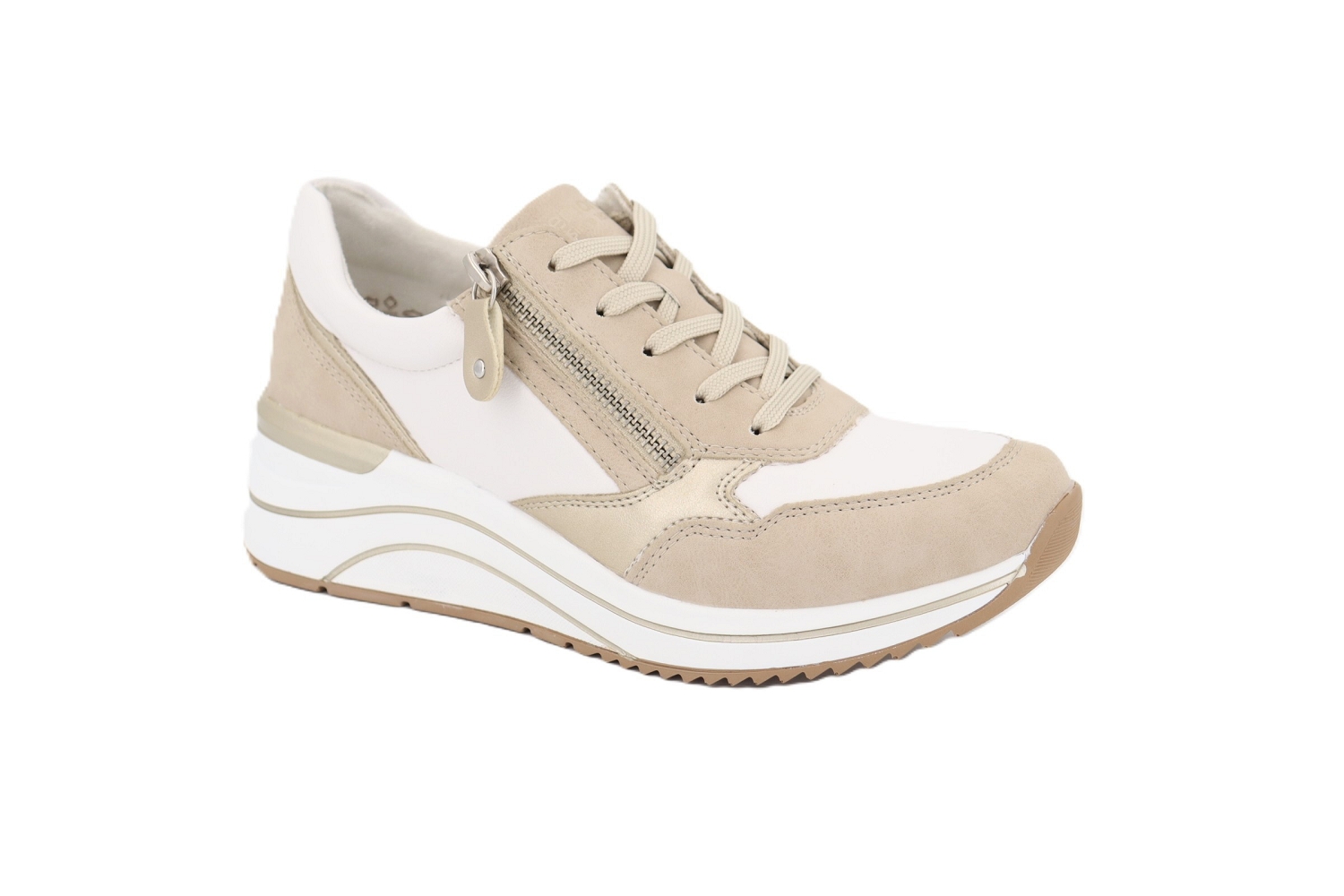 La basket Paradise de Remonte séduit par son coloris beige irisé associé au blanc, pour une allure douce et lumineuse. Dotée de lacets et d'une fermeture zippée latérale, elle assure un enfilage facile et un ajustement précis. Sa semelle confortable légèrement compensée offre un excellent amorti au quotidien, idéale pour allier style, confort et modernité tout au long de la journée.