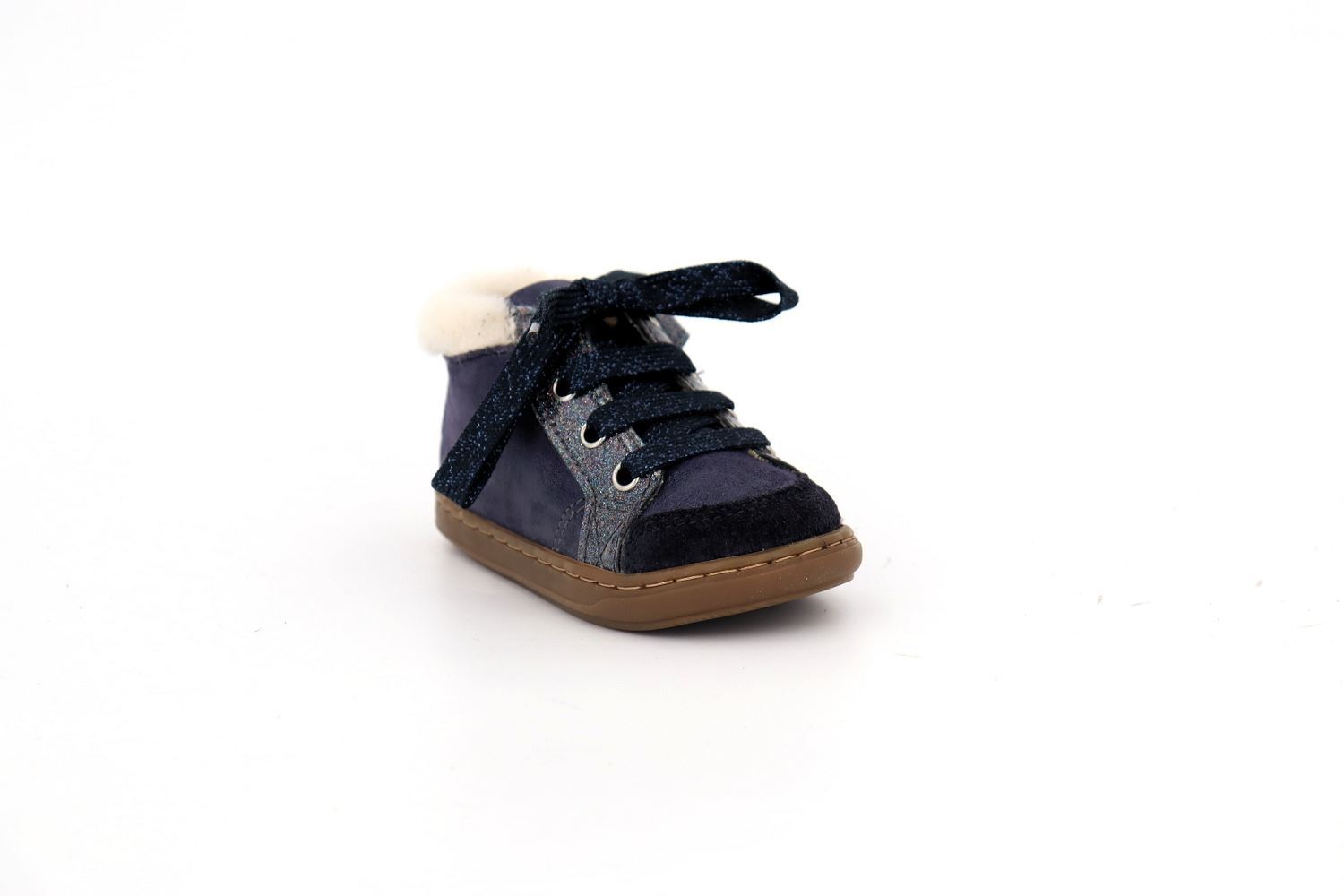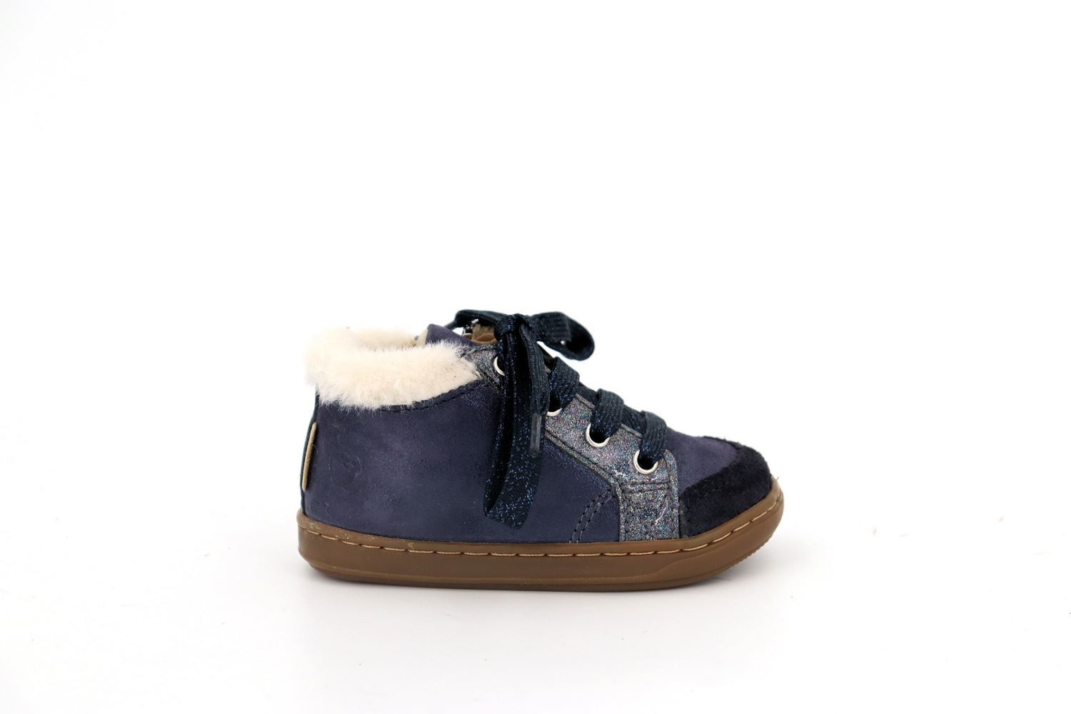 Cette chaussure fourré premiers-pas pour enfants est présentée dans une version en cuir irisé bleu marine. Cette chaussure légère et souple est conçue avec des matériaux de qualité pour le bon développement du pied. Elle a une tige haute avec laçage pour un bon maintien de la cheville et du cou-de-pied. Elle se chausse et se déchausse facilement grâce à son zip intérieur.