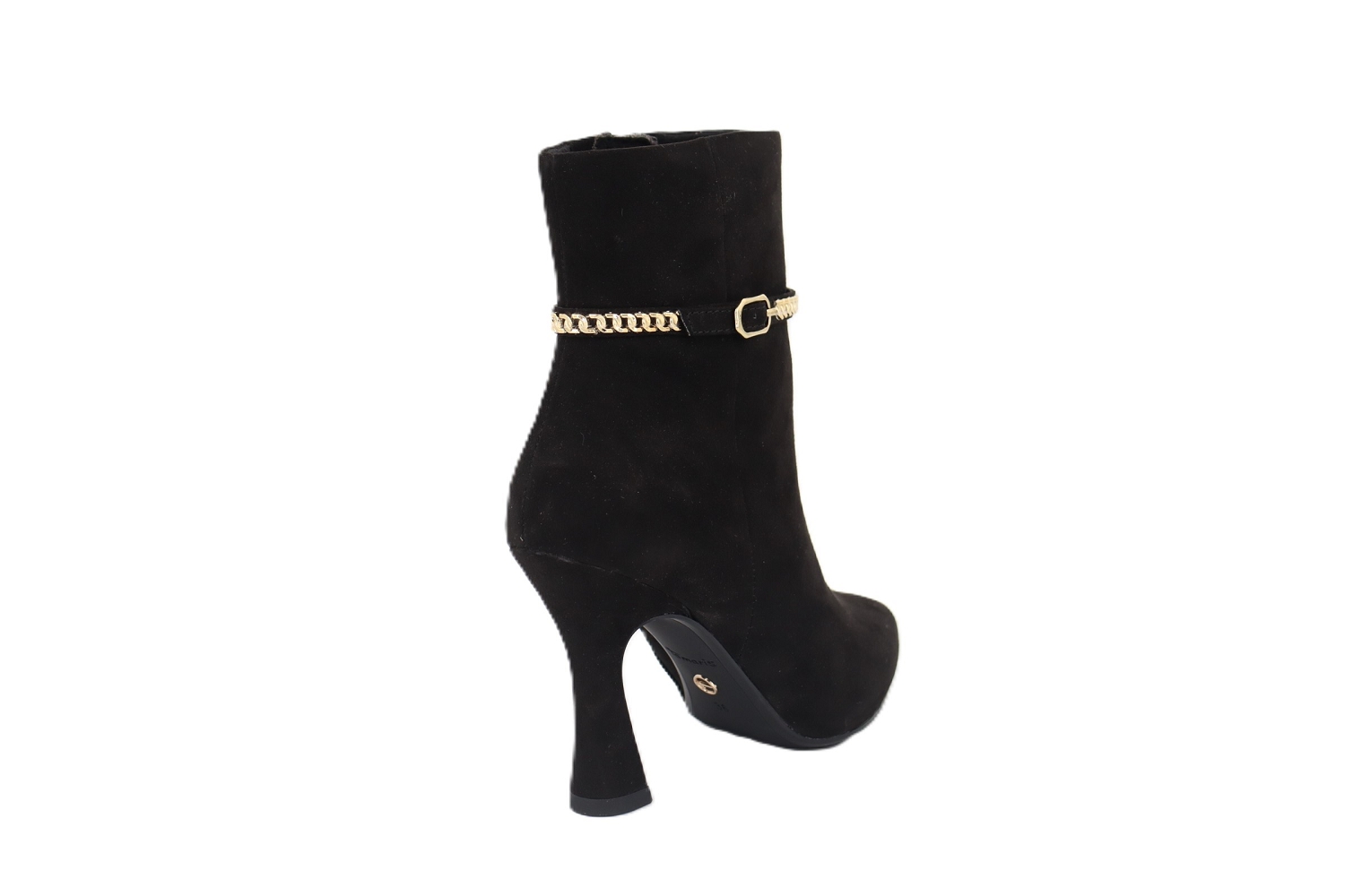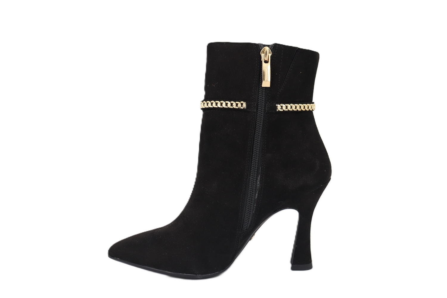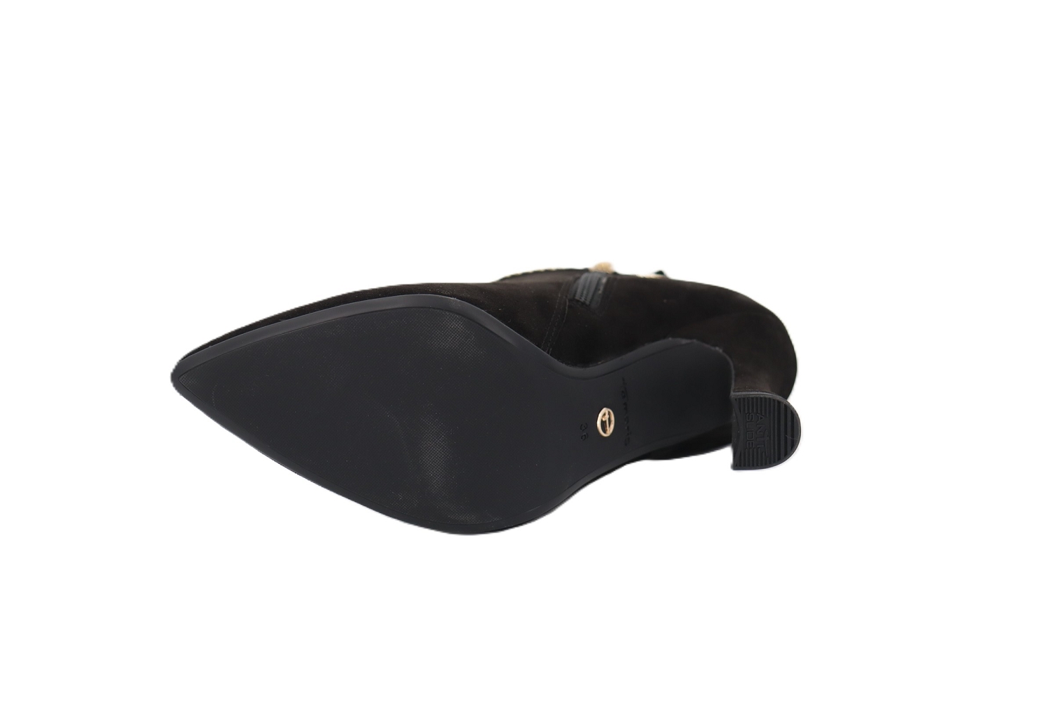 Chic et féminine, la boot Tamaris 25014 sublime la silhouette avec élégance. Confectionnée en matière synthétique effet suède, elle se distingue par son talon aiguille de 9,5 cm et sa chaîne dorée ornant la cheville, pour une touche glamour raffinée. Son bout pointu allonge la jambe, tandis que la semelle TOUCH-IT à mémoire de forme assure un confort optimal malgré la hauteur. Facile à enfiler grâce à sa fermeture zippée latérale, cette bottine noire incarne la parfaite alliance du style et du confort pour vos tenues habillées ou de soirée.