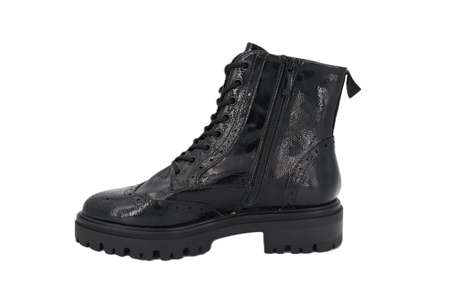 Ces bottines Tamaris effet noir vernis revisitent le style brogue avec une touche résolument moderne. Leur synthétique verni accompagné de perforations décoratives donne une allure élégante et sophistiquée, tandis que la semelle crantée épaisse apporte une touche urbaine et affirmée. Dotées d'un laçage montant pour un maintien parfait, elles offrent également un confort optimal au quotidien. Une paire idéale pour dynamiser vos tenues, entre féminité chic et esprit rock.