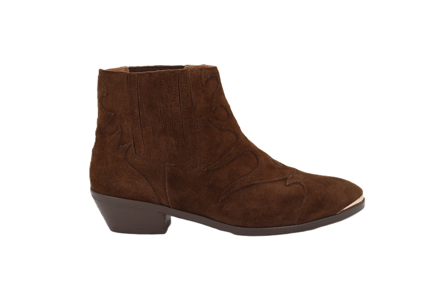 La bottine Sonia Metal, réalisée en daim dans une riche teinte marron, réinterprète avec audace le style western classique. Ses surpiqûres discrètes et son bout métallique apportent une touche de caractère à sa silhouette cowboy. Les empiècements élastiqués sur les côtés garantissent un maintien parfait et un confort optimal. Une version contemporaine d’un intemporel iconique.