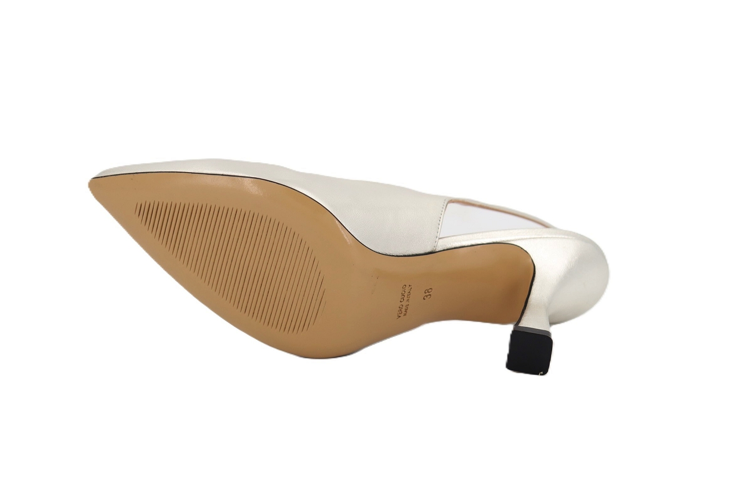 L'escarpin à bride arrière DIVINITA de chez Vitulli illumine la silhouette avec son cuir doré au fini délicatement métallisé. Sa ligne élancée et sa pointe effilée apportent une touche de féminité et d'élégance, idéale pour sublimer aussi bien une tenue habillée qu'un look plus sobre. Monté sur un talon fin et stable, il assure une démarche élégante tout en offrant un bon confort. La bride arrière réglable garantit un maintien sûr, faisant du modèle DIVINITA un choix parfait pour les occasions spéciales comme pour les soirées chics du quotidien.